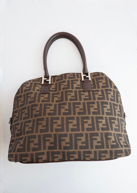 Authentic Preownd Vintage Fendi Brown Canvas Zucca Bowler Shoulder Bag