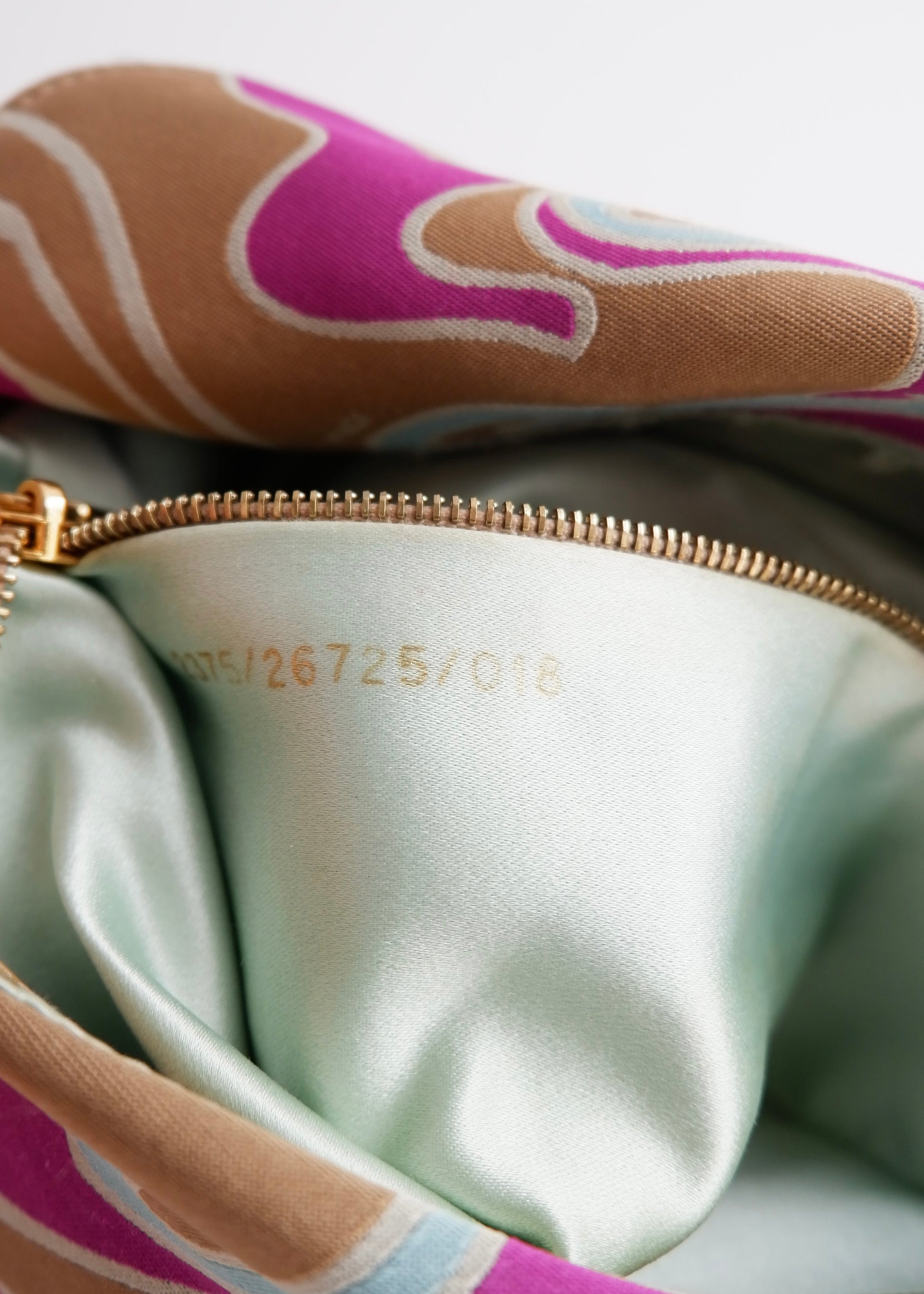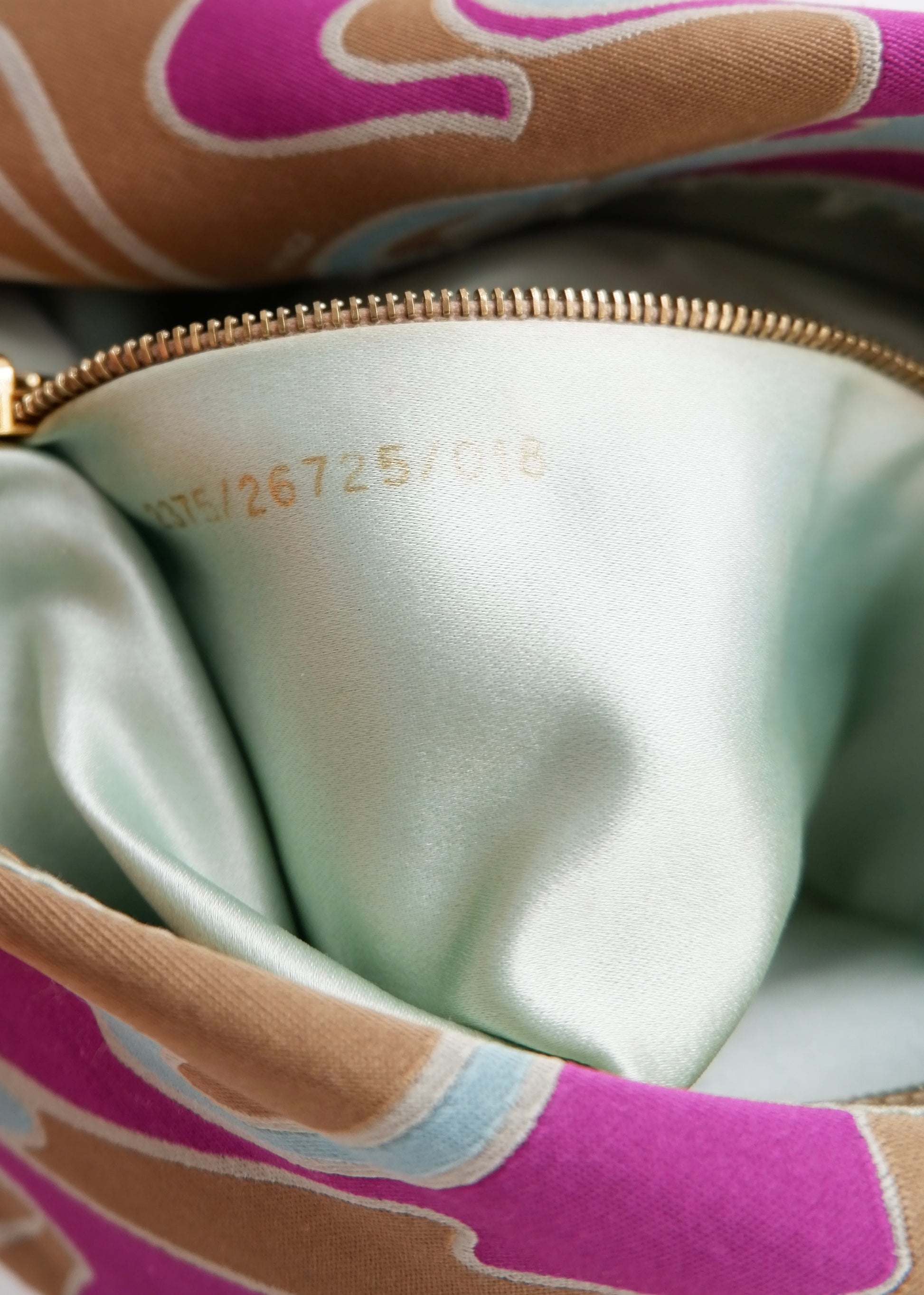 Condition: 8/10 Good Condition - Sublte pulls on the silk exterior. Marks on the bottom of the bag, as shown in photos.