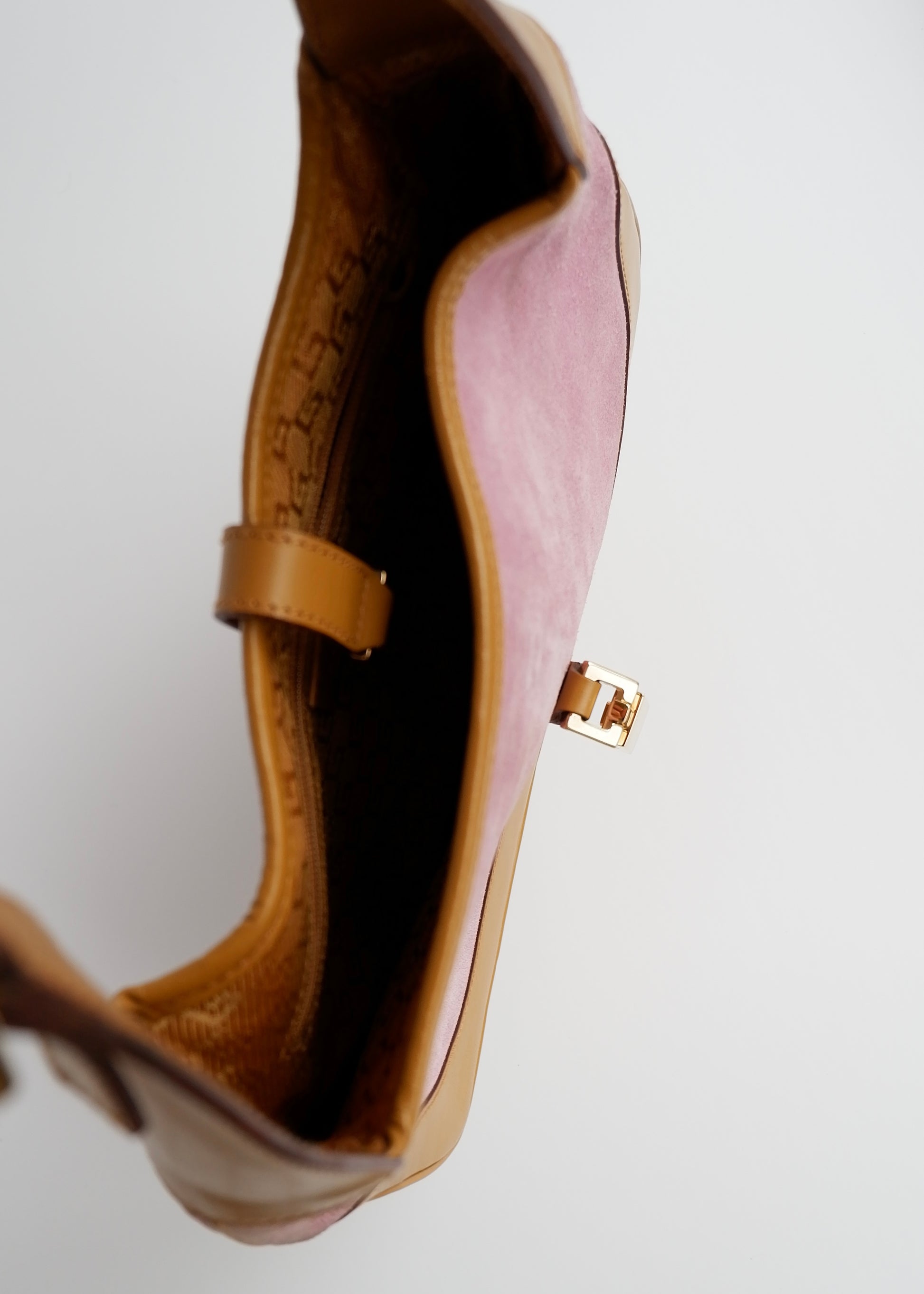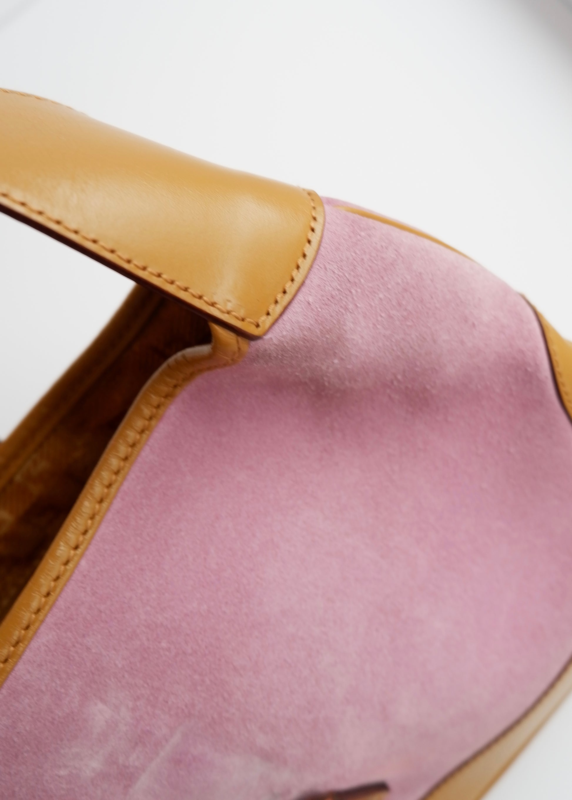 Condition: 8/10 - General signs of wear. Some warping of the leather shoulder strap due to wear and age. Subtle marks on the purple suede material are near the two sides, close to the shoulder strap.