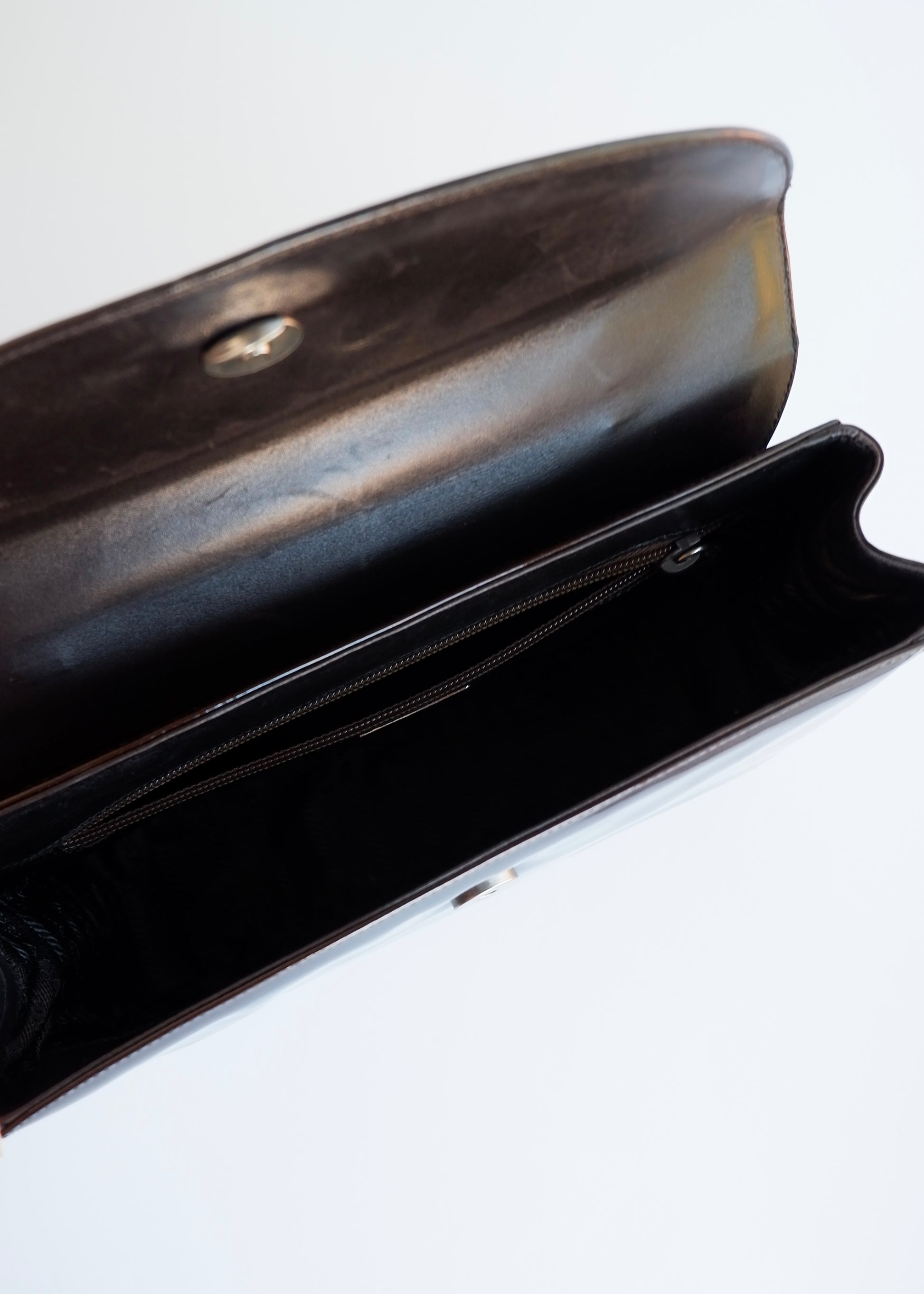 Condition: 8/10 – Good Condition. This bag shows light, general signs of wear. There is a subtle colour transfer on the underside of the top flap — a natural characteristic of patent leather, which can easily absorb colour if stored or worn in contact with other items. Overall, the exterior maintains a beautiful shine and the interior is clean.