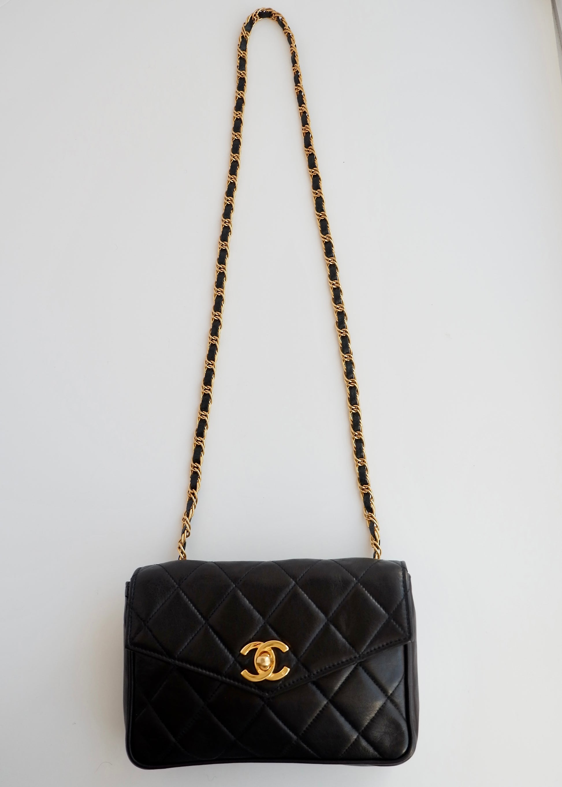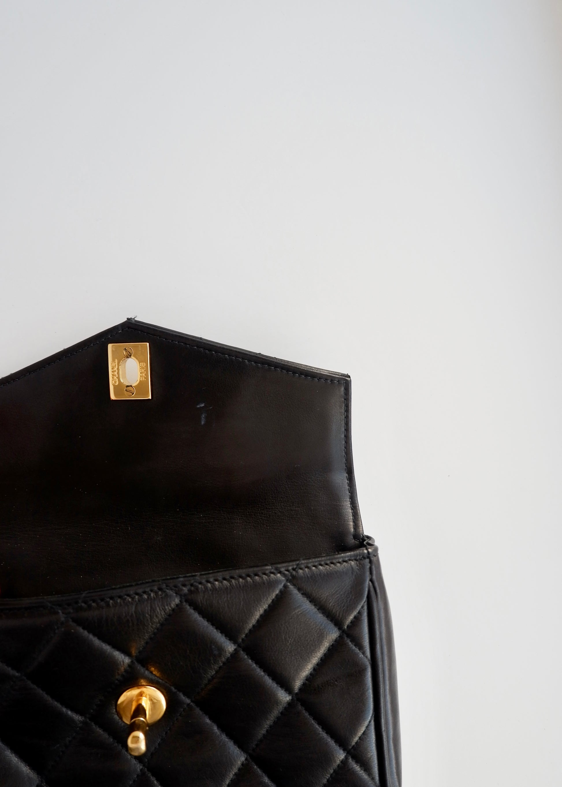 Condition: 8/10 Good Vintage Condition - General signs of age. There are no major scratches or scuffs on the exterior lambskin leather. Clean interior. This bag does not have its original black leather belt strap. A vintage gold/black faux leather chain strap is included with the bag.