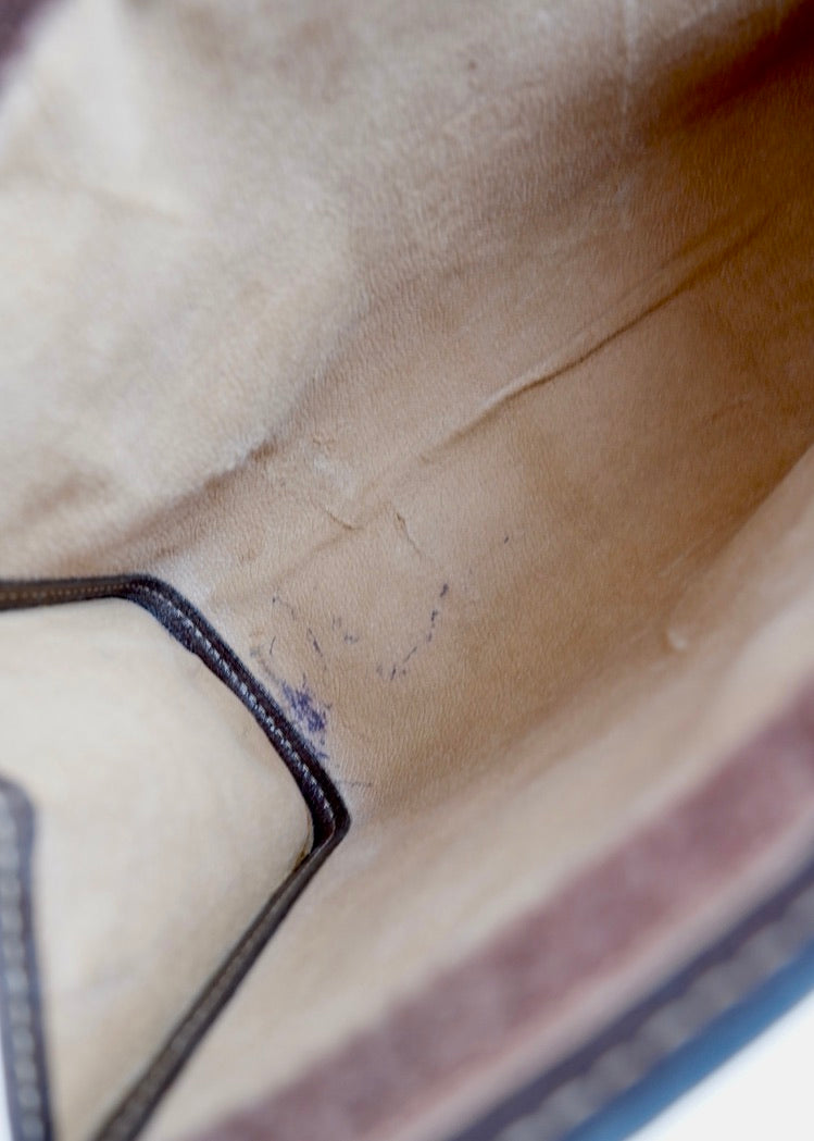 Condition: 8/10 Good Vintage Condition - Subt;e scuffs on the exterior leather trim of the bag as shown in photos. Signs of wear on the interior of the bag, including pen marks.